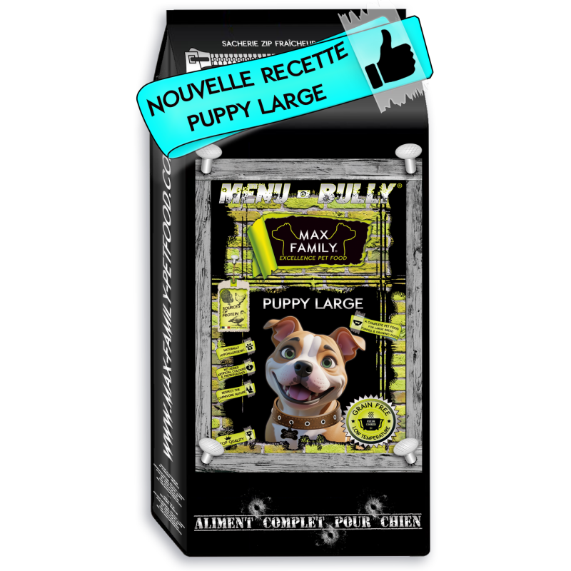 Recette formulée pour les chiots de Grandes Races (Poids adulte +20kg), de 4 mois à 18/24 mois. Convient parfaitement aux femelles gestantes et allaitantes. Riche en viande de haute qualité, SANS Céréale. Cette croquette contient du glucosamine et de la chondroïtine: Pour un développement robuste des articulations et du cartilage avec un niveaux élevés de protéines & minéraux, bien équilibrés, adaptés aux chiots en croissance pour contribuer au bon développement squelettique et musculaire. Elle contient aussi des prébiotiques naturels grâce à de fibre de chicorée afin développer et de maintenir un microbiote intestinal sain. Le mode de cuisson à froid quant à lui, avec l’ajout d’oligo-éléments et une teneur élevée en vitamines, contribue à renforcer les défenses naturelles. Une formulation sans céréale et sans gluten, pour assurer un bien-être cutané et digestif optimal, qui convient aux chiots ayant une intolérance ou une sensibilité aux céréales. garanti sans ajout d’arôme artificiel, ni conservateur, ni colorant.