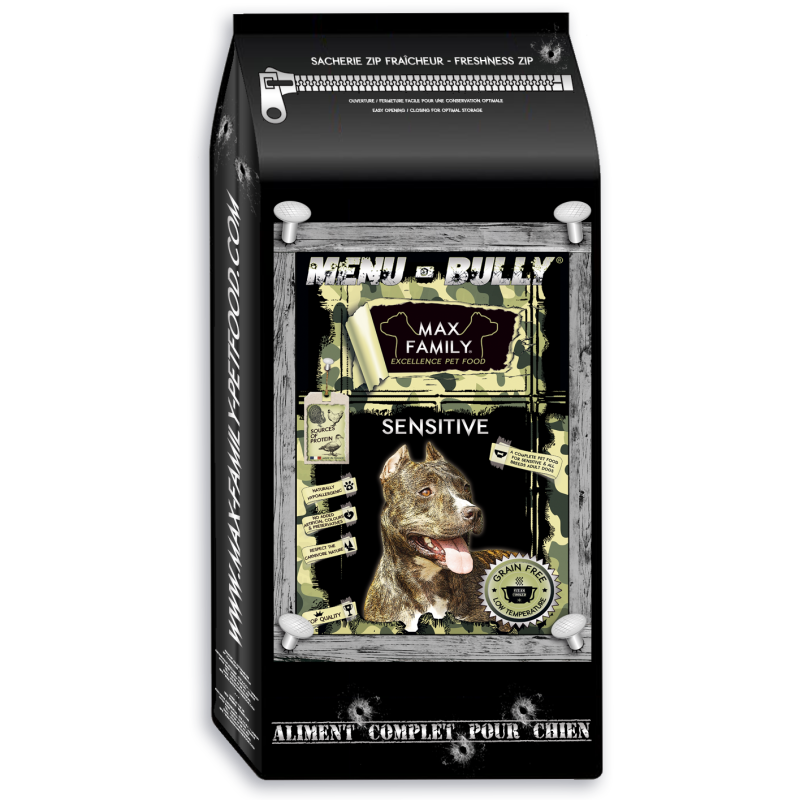 Dédicacé aux Molosses & Cie , recette formulée pour tous les chiens sensibles, de toutes races et de tout âge . Idéale pour les chiens ayant des systèmes digestifs sensibles, démangeaisons de peau ou poils ternes. Les chiens sensibles sont souvent soumis à des réactions allergiques / affections cutanées (peau sèche, démangeaisons, eczéma…) ou des problèmes digestifs / intolérances alimentaires (diarrhée, constipation…). La cause de ces problèmes de peau est généralement liée à leur régime alimentaire, provoquée entre autre et en fonction des chiens par le blé, le lactose, le bœuf et produits dérivés du soja… Formulation hypoallergénique sans céréale pour un bien-être cutané et digestif optimal.