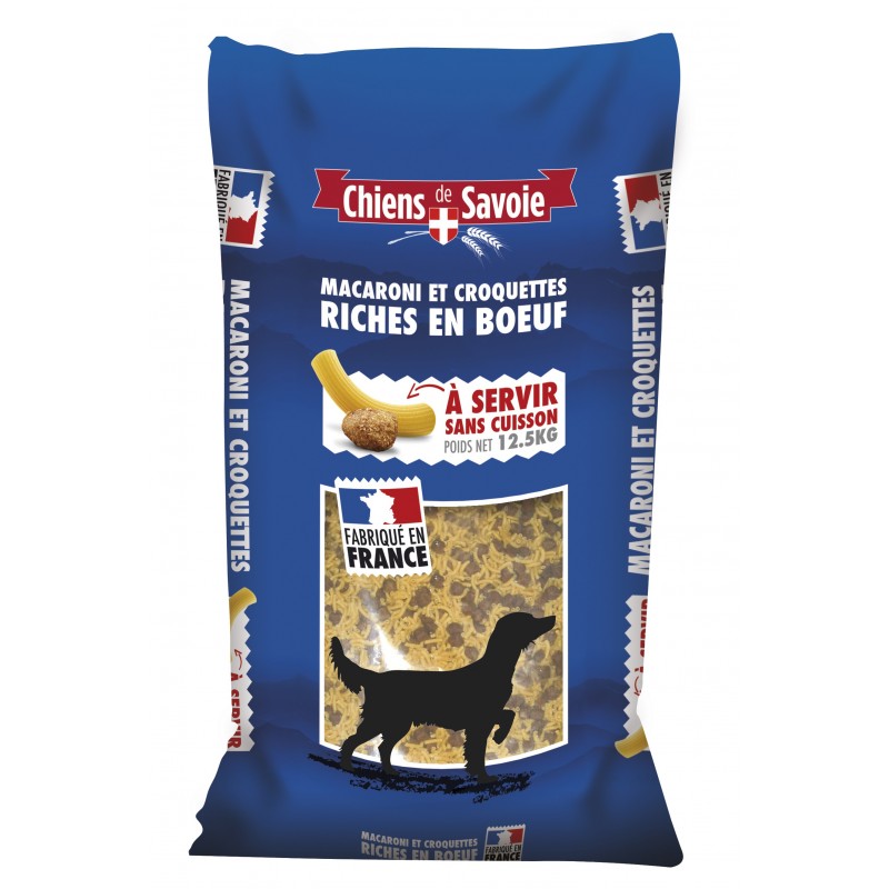 Céréales et viandes (dont bœuf 14%, issu de bœuf déshydraté), sous produits d’origine végétale, huiles et graisses, substances minérales. Macaroni : céréales. Torsades : céréales, jaune d’œuf (4% issus de jaune d’œuf déshydraté) dans les torsades au jaune d’œuf ; tomate (4% issus de tomate déshydratée), additif : colorant oléorésine de paprika dans les torsades rouges.