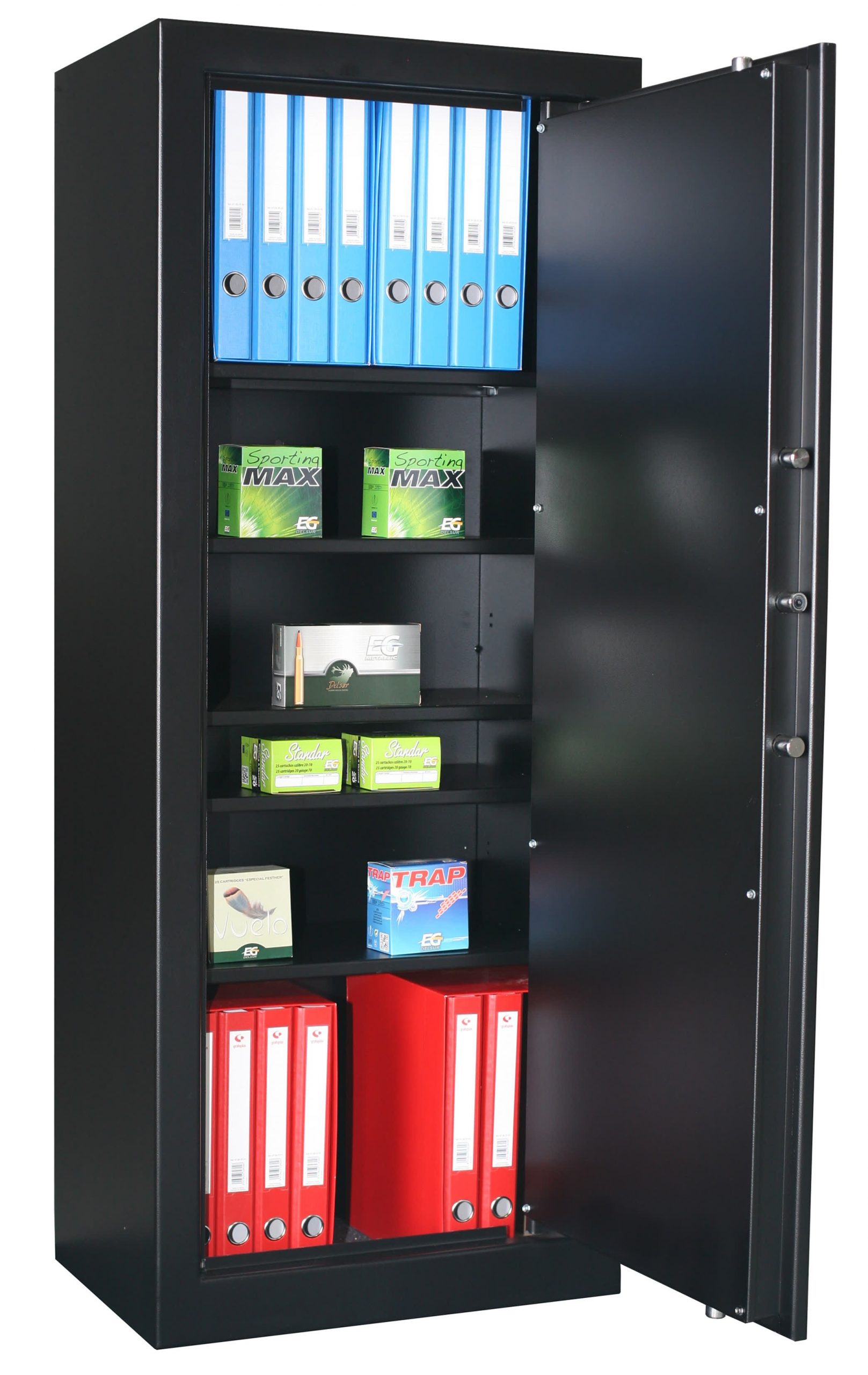 Corps et porte en acier de première qualité, épaisseur 3 mm. Porte double paroi avec système anti-levier. Verrouillage par 5 cylindres en acier de diamètre 25 mm et de grande profondeur. Serrure de haute sécurité à 7 lames (2 clés fournies). Poignée ronde extra-plate. Trous prévus pour la fixation au sol et au mur. 2 vis et chevilles pour support béton fournies (pour la fixation au sol). 5 étagères renforcées, amovibles et réglables, fournies. Peinture époxy de grande résistance, chauffée à 220°. Couleur : Noir.