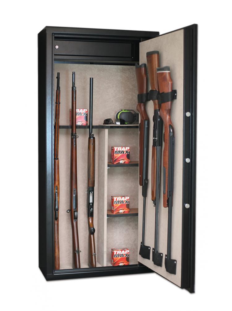 Conforme à la norme européenne de résistance à l’effraction EN14450 classe S1. Corps et porte en acier de première qualité DD12, épaisseur 3 mm. Porte double paroi épaisseur 70 mm avec système anti-levier. 5 cylindres en acier de diamètre 25 mm et de grande profondeur assurant le verrouillage. Serrure de haute sécurité homologuée EN1300 classe A. Plaque de manganèse pour la protection de la serrure Trous prévus pour la fixation au sol et au mur. Poignée ronde extra plate. Coffre intérieur. Moquette intérieure et sur la porte. Râtelier en bois pour 11 armes avec lunette. Supports pour 3 armes supplémentaires sur la porte. Peinture époxy de grande résistance chauffée à 220°. Couleur noir. 2 clés et un jeu de vis avec chevilles pour la fixation fournis. 2 étagères amovibles en bois fournies.