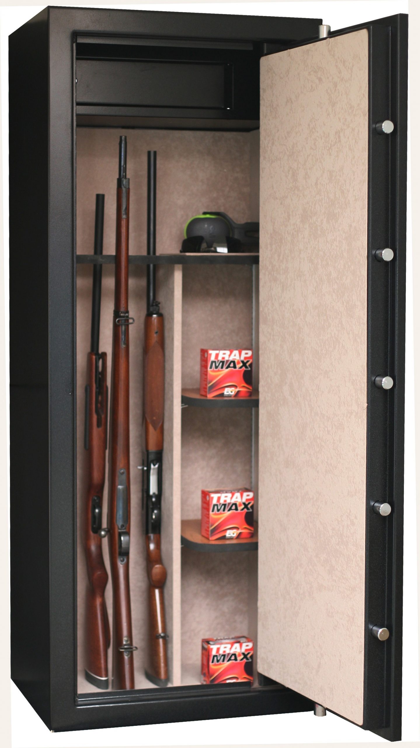 . Verrouillage par 7 cylindres d’Acier diamètre 25 mm montés sur axe tournant. Ouverture par volant 3 branches qui actionne la barre de verrouillage. Profils de corps et de porte étudiés pour résister au forçage avec un pied de biche. Râtelier en bois. 2 étagères amovibles permettant de moduler la capacité de 13 à 18 armes. Coffre intérieur fermant à clé. Trous prévus pour fixation au sol et au mur. Jeu de chevilles + vis de fixation fourni. Moquette intérieure Beige. Peinture en poudre époxy chauffée à 200° / Coloris Noir.