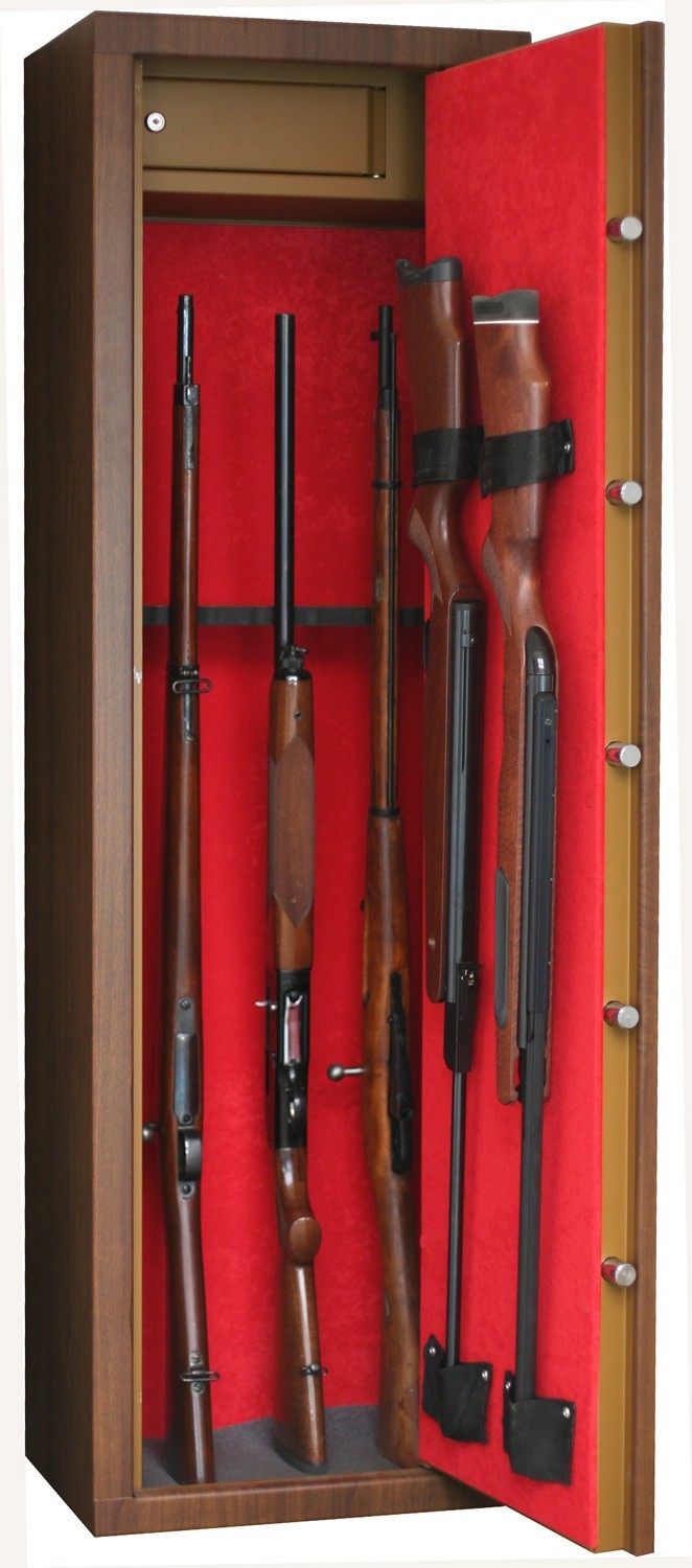 Serrure haute sécurité à 6 lames avec fermeture par clé double pannetons ( fournie avec 2 clés ). Corps Acier de première qualité DD12 / épaisseur 2 mm. Porte double paroi d’épaisseur 58 mm avec système anti-levier. Verrouillage par 5 cylindres d’Acier diamètre 22 mm montés sur axe tournant. Profils de corps et de porte étudiés pour résister au forçage avec un pied de biche. Râtelier en bois. Coffre intérieur fermant à clé / H.160 x L.445 x P.180 mm. Trous prévus pour fixation au sol et au mur. Jeu de chevilles + vis de fixation fourni. Moquette intérieure Beige. Revêtement haute résistance avec peinture époxy chauffée à 220°C. Coloris : aspect Bois obtenu par transfert de peinture.
