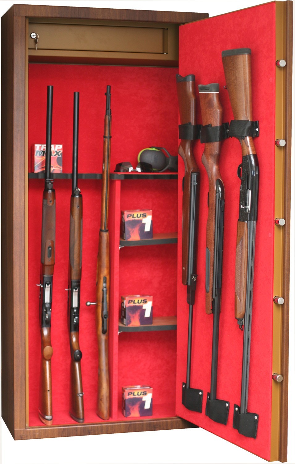 Serrure haute sécurité à 6 lames avec fermeture par clé double pannetons ( fournie avec 2 clés ). Corps Acier de première qualité DD12 / épaisseur 2 mm. Porte double paroi d’épaisseur 58 mm avec système anti-levier. Verrouillage par 5 cylindres d’Acier diamètre 22 mm montés sur axe tournant. Profils de corps et de porte étudiés pour résister au forçage avec un pied de biche. Râtelier en bois. Etagères amovibles permettant de moduler la capacité de 10 à 14 armes : profondeur 19 cm, largeur 27 cm.Coffre intérieur fermant à clé / H.160 x L.695 x P.180 mm. Trous prévus pour fixation au sol et au mur. Jeu de chevilles + vis de fixation fourni. Moquette intérieure Beige. Revêtement haute résistance avec peinture époxy chauffée à 220°C. Coloris : aspect Bois obtenu par transfert de peinture.