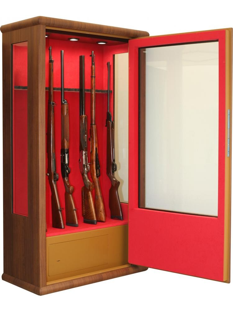 Serrure haute sécurité avec fermeture par clé.  Livrée avec 3 clés (pas de possibilité de refaire la clé). Corps Acier de première qualité DD12 / épaisseur 3 mm . Porte double paroi avec système anti-levier.  Vitre anti-effraction en verre feuilleté sécurisé PS13.  Verrouillage 3 points haut, bas et central. Profils de corps et de porte étudiés pour résister au forçage avec un pied de biche.  Râtelier en bois.  Coffre intérieur fermant à clé / H.320 x L.890 x P.280 mm. Moquette intérieure Rouge.  Eclairage intérieur basse température. Revêtement haute résistance avec peinture époxy chauffée à 220°C. Coloris : aspect Bois obtenu par transfert de peinture. Le verre utilisé sur nos vitrines est du verre feuilleté sécurisé PS13 (anti-vandalisme).