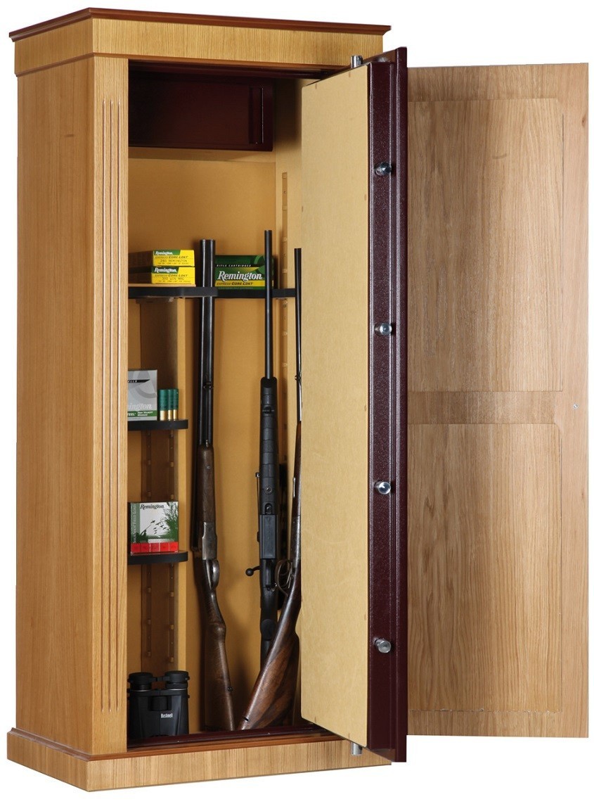 Serrure au choix : 1/ Serrure haute sécurité avec fermeture par clé double pannetons ( fournie avec 2 clés ). 2/ serrure électronique à code 6 chiffres avec clé d’urgence. Corps Acier de première qualité DD12 / épaisseur 3 mm.  Porte double paroi avec système anti-levier. Verrouillage par 6 cylindres d’Acier diamètre 25 mm montés sur axe tournant.  Profils de corps et de porte étudiés pour résister au forçage avec un pied de biche. Ouverture par poignée-manette qui actionne la barre de verrouillage.  Râtelier en bois. 2 étagères amovibles. Coffre intérieur fermant à clé / H.200 x L.590 x P.200 mm.  Trous prévus pour fixation au sol et au mur.  Jeu de chevilles + vis de fixation fourni. Moquette intérieure Beige. Revêtement haute résistance avec peinture époxy chauffée à 220°C.  Habillage : placage Chêne clair