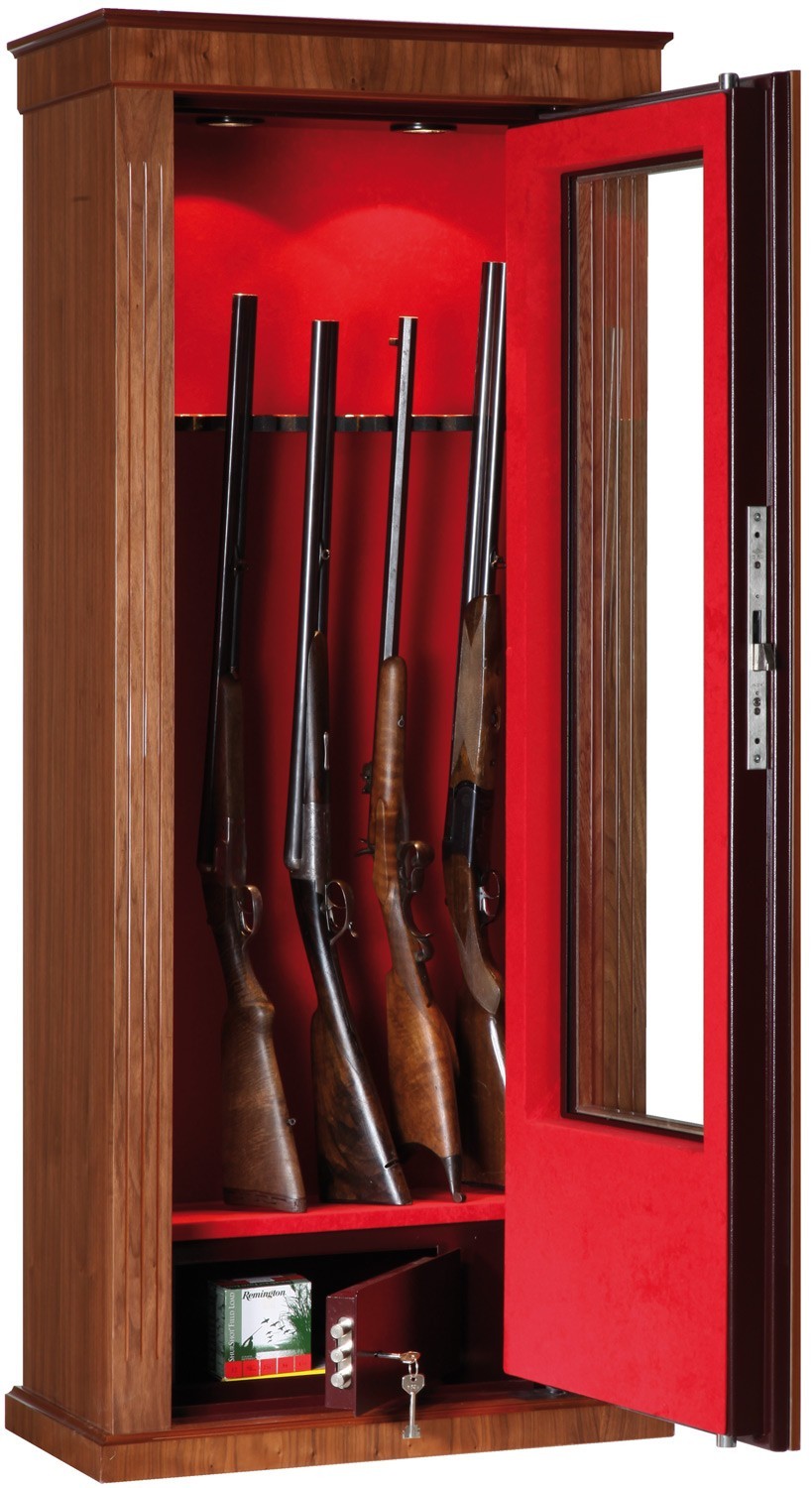Serrure haute sécurité avec fermeture par clé ( fournie avec 2 clés ). Corps Acier de première qualité DD12 / épaisseur 3 mm. Porte double paroi avec système anti-levier. Vitre anti-effraction en verre feuilleté sécurisé PS13. Verrouillage 3 points haut, bas et central. Profils de corps et de porte étudiés pour résister au forçage avec un pied de biche. Râtelier en bois. Coffre intérieur fermant à clé / H.230 x L.590 x P.230 mm. Trous prévus pour fixation au sol et au mur. Jeu de chevilles + vis de fixation fourni. Moquette intérieure Rouge. Eclairage intérieur basse température. Revêtement haute résistance avec peinture époxy chauffée à 220°C. Habillage : placage Noyer foncé (existe également en Chêne clair). Le verre utilisé sur nos vitrines est du verre feuilleté sécurisé PS13 (anti-vandalisme).