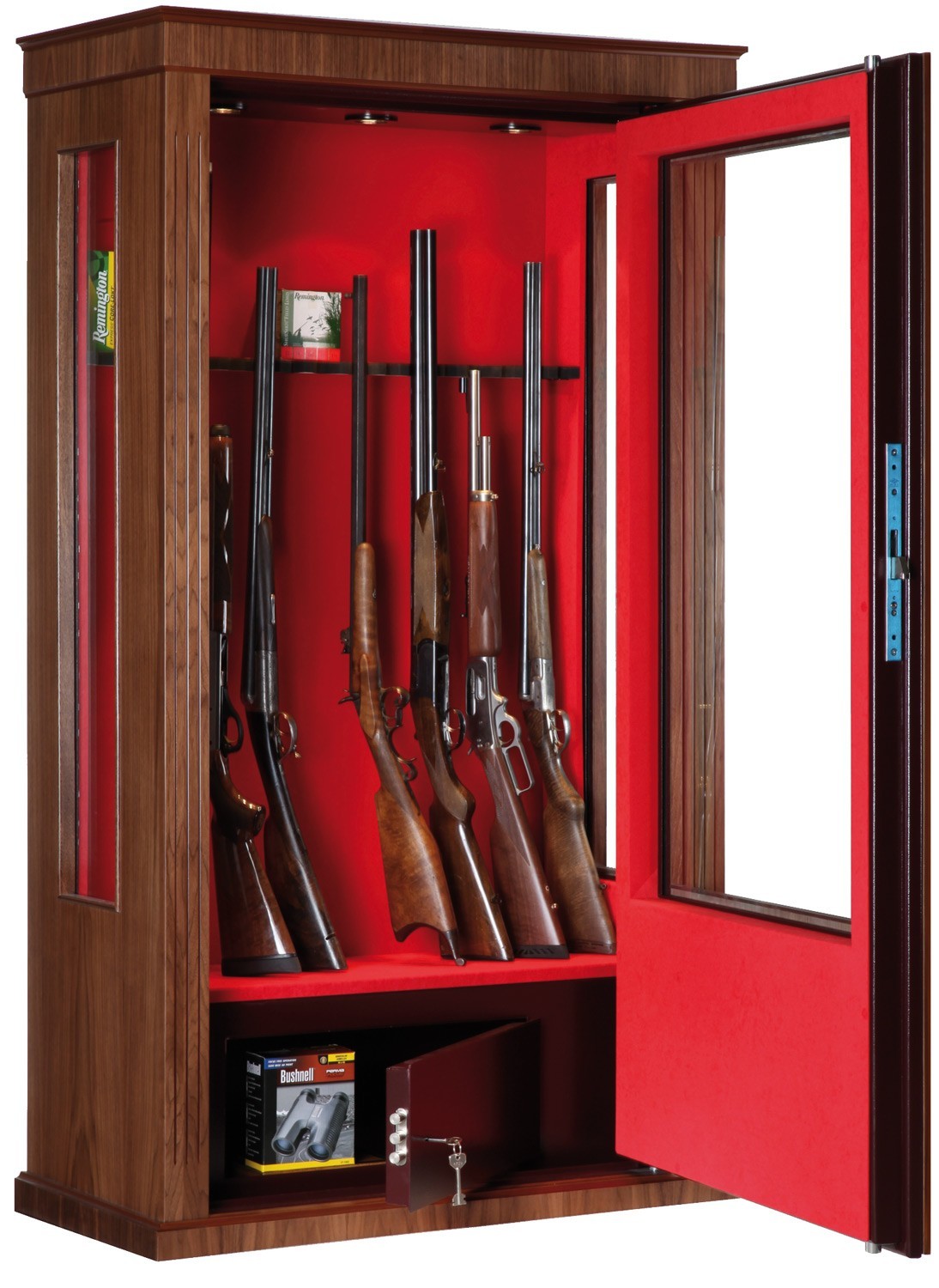 Serrure haute sécurité avec fermeture par clé ( fournie avec 2 clés ). Corps Acier de première qualité DD12 / épaisseur 3 mm. Porte double paroi avec système anti-levier. Vitre anti-effraction en verre feuilleté sécurisé PS13. Verrouillage 3 points haut, bas et central. Profils de corps et de porte étudiés pour résister au forçage avec un pied de biche. Râtelier en bois. Coffre intérieur fermant à clé / H.320 x L.890 x P.280 mm. Trous prévus pour fixation au sol et au mur. Jeu de chevilles + vis de fixation fourni. Moquette intérieure Rouge. Eclairage intérieur basse température. Revêtement haute résistance avec peinture époxy chauffée à 220°C. Habillage : placage Noyer foncé (existe également en Chêne clair). Le verre utilisé sur nos vitrines est du verre feuilleté sécurisé PS13 (anti-vandalisme).