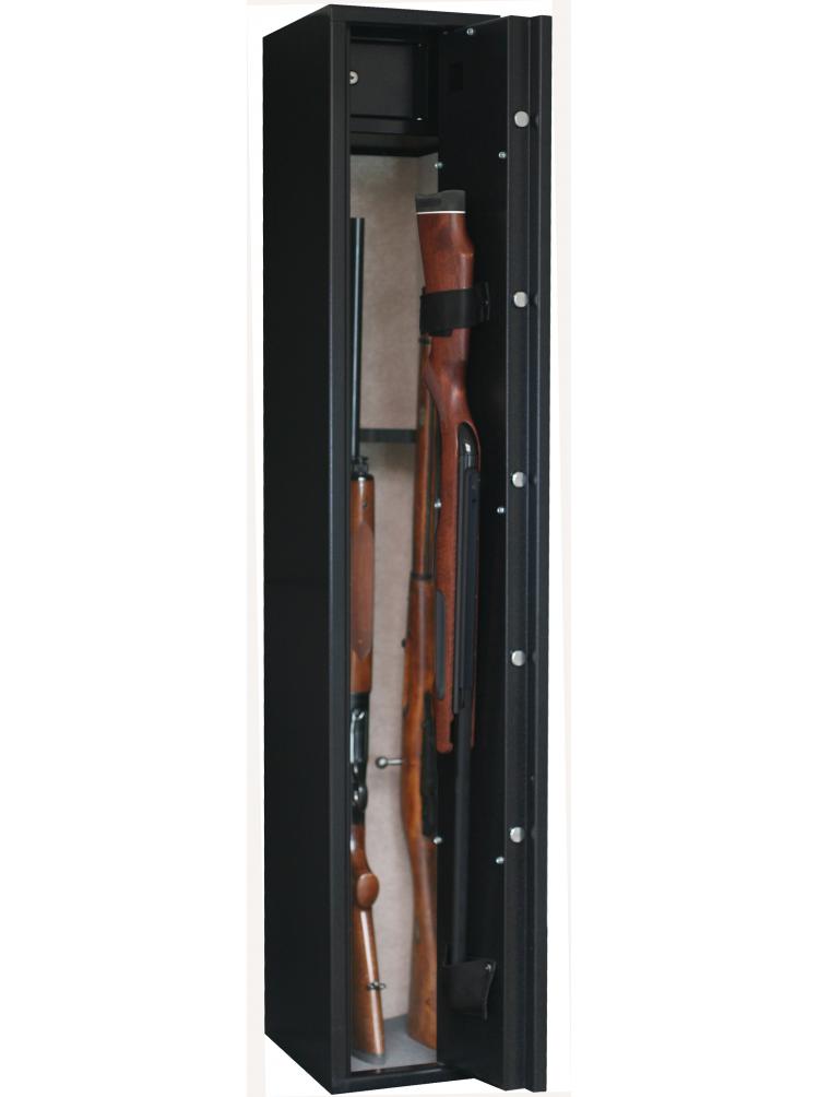 Corps et porte en acier de première qualité DD12, épaisseur 2 mm. Porte double paroi épaisseur 55 mm avec système anti-levier. 5 cylindres en acier de diamètre 22 mm et de grande profondeur assurant le verrouillage. Serrure de haute sécurité à 6 lames avec clé à double panneton. Trous prévus pour la fixation au sol et au mur. Coffre intérieur. Moquette intérieure. Râtelier en bois pour 4 armes avec lunette. Support pour 1 arme supplémentaire dans la porte. Peinture époxy de grande résistance chauffée à 220°. Couleur noir. 2 clés et un jeu de vis avec chevilles pour la fixation fournis.