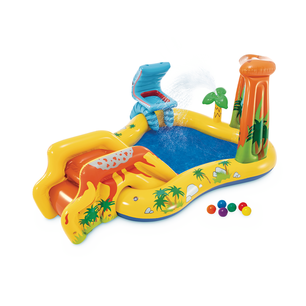 Accessible grâce à sa faible hauteur d’eau, cette aire de jeux garantit à vos enfants fraîcheur et divertissement tout au long de la journée. Ils pourront glisser sur le toboggan, plonger dans la piscine et nourrir le dinosaure avec des balles colorées ! Envie de fraîcheur ? Branchez un tuyau d’arrosage à la petite piscine ludique pour faire jaillir un jet d’eau du palmier, et laissez la cascade les aider à affronter les fortes chaleurs. Cette aire de jeux gonflable occupera vos petits tout l’été, pour le plus grand bonheur des enfants… Si votre enfant est passionné par les dinosaures, ce décor est fait pour lui. Entre volcan en éruption, dinosaure gourmand, palmiers et cascade, vos petits aventuriers seront transportés au cœur du monde jurassique. Comme de vrais explorateurs, ils pourront glisser le long du volcan et s’approcher du dinosaure gonflable. Pas d’inquiétude, ce dernier est bien plus joueur qu’effrayant !
